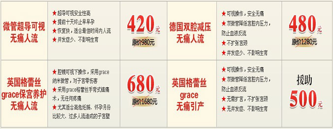 作為安徽計劃生育定點合作單位,經省衛生廳聯合決定,廬江康平婦產醫院被授予安徽省意外懷孕援助基地,通過援助基金的發放使的人流價格比其他醫院低30%-60%。人流幾個透明公示如下:微管超導可視無痛人流420元(原價980元)、德國雙腔減壓無痛人流480元(原價1280元)、英國格蕾絲保宮養護型人流680元(原價1680元)、英國格蕾絲無痛引產援助500元。溫馨提示,由于申請援助的人數過多,如需基金援助請點擊網絡預約,免除排隊等候,節約您的時間?!?a href="http://www.bcll.cn/zthd/" target="_blank">查看援助詳情